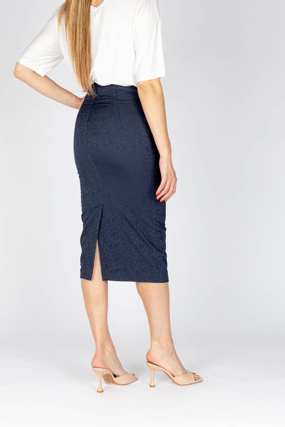 L'occhio sarà catturato dalla splendida eleganza del tessuto jacquard con disegno a fiore, dalla linea a tubino longuette e dalla vita alta effetto bustier.