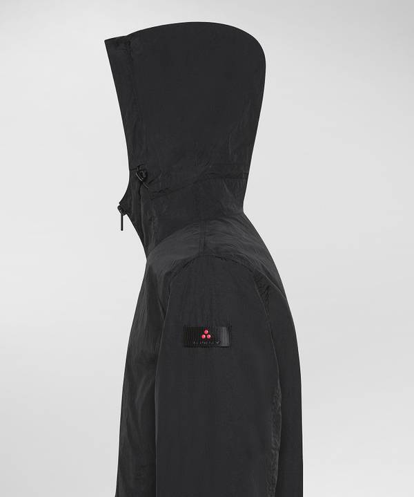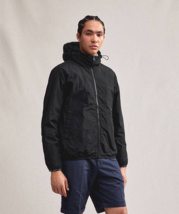 Giacca a vento in tela leggera di nylon, dall'aspetto crinkle generato dalla tintura e dal finissaggio finale. Full zip centrale nera, tasche laterali e cappuccio fisso regolato da tiranti. Un modello idrorepellente che assicura isolamento termico e resistenza all'umidità.